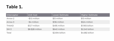 For the 80 SM-3 interceptors the cost would depend on the variant used, Block-IA, -IB, or -IIA. While no Block-IA interceptors have been procured recently, each cost around $10 million. The cost of the SM-3 Block-IB has fluctuated, perhaps based on the size of the buy.[27] When around 40 interceptors were bought each year, the Block-IB were $8 million each, but rose to over $19 million in recent years as procurement numbers declined.[28] The Block-IIA cost over $28 million each, and only 12 have been procured each year from FY24 through FY26.[29] Given the variance, the 80 SM-3s cost between $640 million and $2.24 billion.
